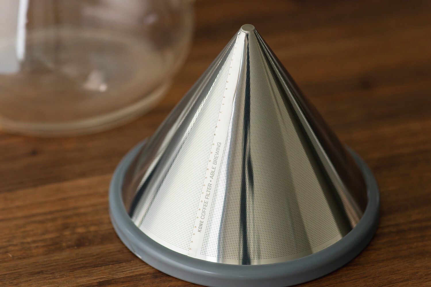 The Kone's design features square-to-round holes, graduated-density hole pattern, and a polished mirror finish. This combination improves water flow and keeps sediment from passing through the filter for better extraction and more consistent flavor.