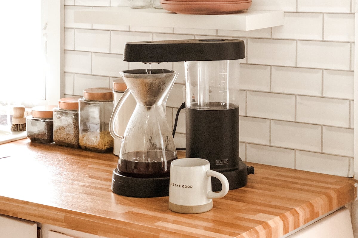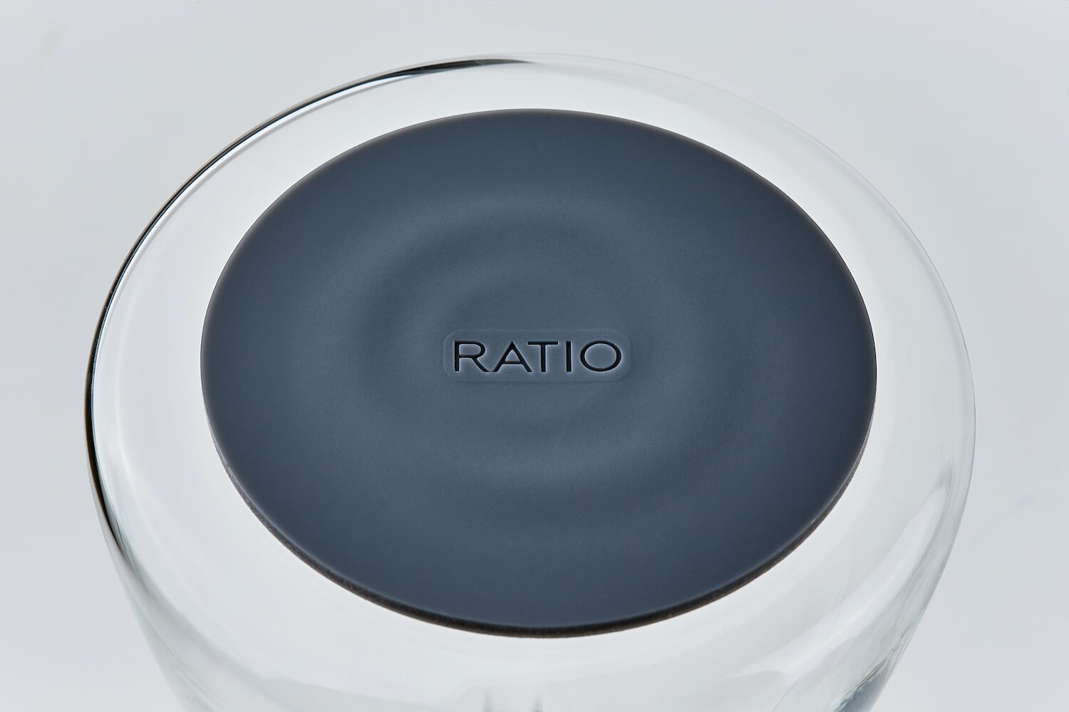 The carafe features a silicone base with a magnetic activator to engage Ratio Eight, giving a gentle pad to protect your tabletop.