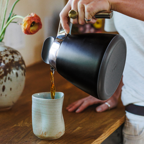 Ratio machines don’t use a hot plate. Hot plates tend to overheat coffee, causing bitterness and a burnt flavor over time. Instead, our brewers have the option to be paired with a double-wall stainless steel thermal carafe that keeps coffee hot long enough to enjoy a full pot without altering the taste. If you prefer a glass carafe, we recommend serving right away or transferring your brew to an insulated vessel for the best flavor and temperature.